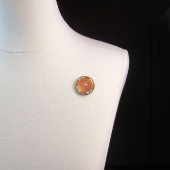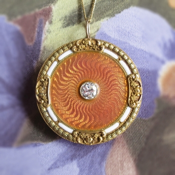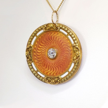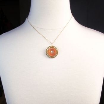 I truly can't keep everything! Let me share my love of antique jewelry and PLEASE someone acquire this piece of art before I do! This is one incredible and authentic early Victorian Era French Guilloche enamel convertible brooch pendant with a newly added folding bale for the perfect heirloom bauble! This piece has pristine coral-tangerine enamel with white enamel accents and hand chased gold workmanship. The central .35ct old mine cut diamond is absolutely breathtaking! That diamond has the quality range of G-H color VVS2-VS1 clarity. The brooch measures 28.5mm in diameter and measures 2.6mm thick. The pin/pendant is a substantial 11.8 grams in rich 14k yellow gold and is adorned on an 16" inch 18k yellow gold delicate chain. Questions are welcomed on Pendant-1497.