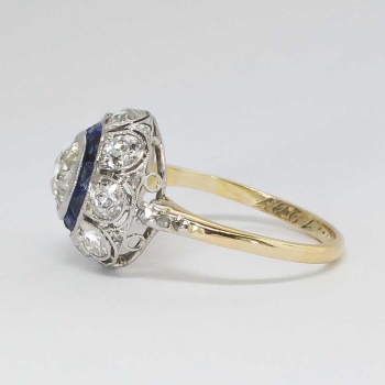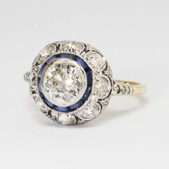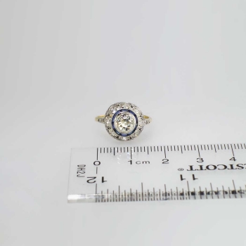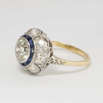 Don't let this special diamond engagement ring pass you by, or tell a friend because this is the first of it's kind I have seen! A chickpea-sized brilliant bauble from our past! This magnificent ring features a central old European cut round diamond with incredible brilliance and shine. It weighs an approximate .85cts (J-K color, SI2 clarity) but is a deep stone so may be larger as most older cuts are! That diamond is surrounded by a halo of calibre' cut lab created blue sapphires. Surrounding those blue stones are eight old European cut diamonds (.10cts each, H-J color, VS1-SI1 clarity) and 8 .005ct rose cut diamonds with comparable quality in-between each design. All of the open platinum filigree work is accented by detailed milgraining. The sides have a delicate circular and ball design, leading into the 18K yellow gold shank that has two additional Rose Cut diamonds on each side. The total approximately carat weight is 1.65ct t.w.. What a spectacular find! This ring is made with a platinum top and 18k yellow gold shank. The ring measures 12mm in diameter and is raised 9mm off the finger. This ring weighs 2.7 grams, is currently a finger size 4.75 and can safely be re-sized by my trusted jeweler up or down three sizes, just ask! This ring is an authentic ANTIQUE (inscription still intact of 1907!) so charm and some wear is to be expected, but in my opinion only makes it more desirable! Questions are welcomed on Ring-1340.