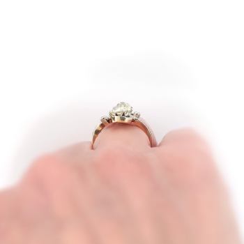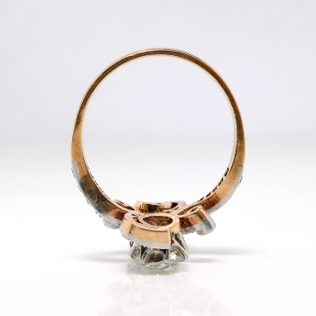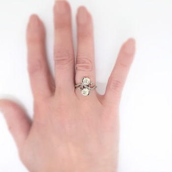 Finding this antique 'Toi Et Moi' ring was like hitting the lottery. I don't mind that the diamonds are't perfectly matched. That they aren't DEF colorless. All I care about is sparkle! And the antique cuts just reel me in every time! The diamonds in this highly sought after Victorian era engagement ring are chunky and glittery in the most unique bypass design I have ever seen! The diamonds are a light yellow (M-N color grade) so if you adore antique jewelry and don't want bright white diamonds but something with majestic charm, please acquire this special engagement/anything ring! This ring is made entirely in 18k rose gold and platinum (tested and guaranteed), and features an array of old mine cut and rose cut diamonds. The ring's two old mine cut diamonds are eight-prong-set in the curves of a platinum S-shaped mounting between two scrolled shoulders, milgrain-edged and bead-set with 19 twinkling rose cut diamonds, on a half-round rose gold shank which measures from 1.81mm to 2.09mm wide. One of the old mine cut diamonds has the quality grade of M-N color, VS2 in clarity, measures approximately 6.14mm in diameter and measures 4.76mm deep, and weighs approximately 1.15 carats. The second old mine cut diamond has the same quality grade range of M-N color, VS2 in clarity, measures approximately 6.06mm in diameter and measures 4.14mm deep, and weighs approximately .97cts. So those two romantic and blissful intertwining diamonds have an estimated grand total diamond weight being 2.12ct t.w.. If your anniversary is 2/12 you better acquire this ring!!! Moving on. The accent rose cut diamonds are graded SI1-SI2 in clarity, H-J in color, measure from approximately 1.00mm to 1.80mm in diameter, weigh from approximately .005cts to .02cts each, making this ring have a grand total diamond weight being 2.27ct t.w.. This ring weighs 4.6 grams and is currently a size 7.25. Jewelry Finds® additional sizing up or down will be determined on a case by case basis so please inquire :). Ring re-sizing takes an additional 3-7 business days by a third party Master Bench Jeweler, not to worry! Your ring is in good hands! This ring is a true antique, circa 1890's, and is being sold as a piece of highly collectible yet wearable art so there is expected wear to the diamonds. So, so beautiful and transcendent. I will be more than happy to email this piece's current retail replacement appraisal upon completion of sale, just ask! Questions are welcomed on Ring-2069.