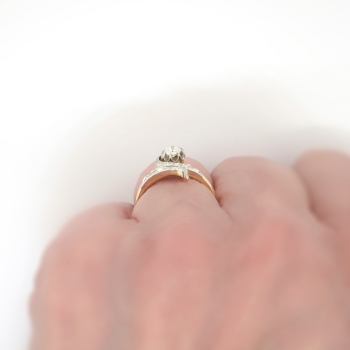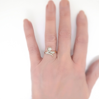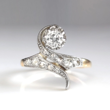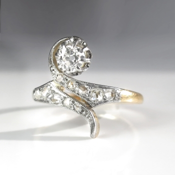 This is a rare and historical piece to own and wear every day for any occasion! A true Art Nouveau era (early 1900's) diamond ring made entirely in 18k yellow and platinum (tested and guaranteed, stamped 750). This ring features a central old mine cut diamond that is graded G color, SI1 clarity and weighs approximately .20cts. That platinum prong set diamond is set in a swirled nouveau-esq design adorned with an additional 10 bead set rose cut diamonds (.20ct t.w. I color, SI1 clarity). This ring has a grand total diamond weight of approximately .40ct t.w.. This ring measures 15mm North to South, 14.75mm East to West, and is raised 4.5mm off the finger. This ring weighs 2.7 grams, is currently a finger size 5.25 and my trusted jeweler can safely re-size this up or down two sizes free of charge and will take an additional 1-5 business days, just ask (additional sizes up or down will be a flat $45.00 gold sizing fee please inquire). Such a special and genuinely unique ring from our past! I will be more than happy to include a current certified retail replacement appraisal upon completion of sale, just ask! Questions are welcomed on Ring-1828.