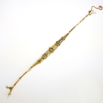 What a beautiful antique diamond two tone bracelet to wear with ANYTHING! This bracelet is made entirely in 18k yellow gold with platinum top (tested and guaranteed). This is an ideal diamond bracelet to add to your antique jewelry collection! This elegant and glittering bracelet can be worn day to night! This bracelet weighs 9.6 grams, measures 6.25" inches in length and 9.14mm at it's widest part (this bracelet can be lengthened by my trusted jeweler if needed, please inquire). It is flexible and is in wonderful antique condition! This bracelet has a total of three old European cut diamonds, ten single cut diamonds, and thirty-eight round rose cut diamonds, between two lengths of open rectangular link chain, terminating in a hidden pressure clasp with figure-eight safety catch and detachable safety chain. The three old European cut diamonds are SI1-SI2 in clarity and H-I in color. One is SI1 in clarity, measures approximately 4.02 x 4.02 x (2.41) mm, and weighs approximately .25 carats. Two measure approximately 3.38 mm in diameter and weigh approximately .14 carats each. The remaining diamonds are SI1-SI2 in clarity, H-J in color, measure from approximately .85 to 2.58 mm in diameter, weigh from approximately .005 to .06 carats each, and have an approximate total weight of .71 carats. This marvelous Art Nouveau era bracelet has a grand total diamond weight being approximately 1.24ct t.w.. I will be more than happy to email an insurance retail replacement appraisal upon completion of sale, just ask! Questions are welcomed on Bracelet-1857.