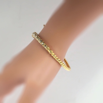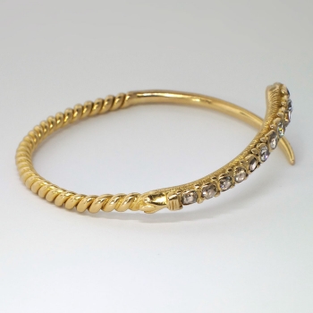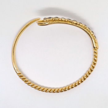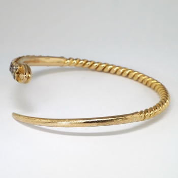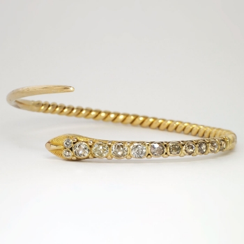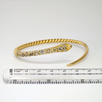 What a marvelous and rare Georgian piece of art! Don't miss out on this chunky old mine cut diamond and solid 18k serpent bracelet! The snake was thought to represent eternity, true love, wisdom and good luck; interestingly it was free of the negative connotations we today would associate with such a fashion choice. Nature inspired themes were found in jewelry throughout the period, as well as romantic themes. The open bangle bracelet measures 8” in diameter (will fit a 6-7" inch wrist comfortably) and from 2.00mm to 6.87mm in width, depicting a dimensional snake bezel-set at the head with twelve old mine cut diamonds. One diamond is SI2 in clarity, J-K in color, measures 4.49 x 4.49 x (2.69) mm, and weighs .35 carats. Two diamonds are SI2 in clarity, M-N in color, measure 4.10 x 4.10 x (2.46) mm, and weigh .26 carats each. One diamond is SI2 in clarity, H-I in color, measures 4.10 x 4.10 x (2.46) mm, and weighs .26 carats. One diamond is SI2 in clarity, K-L in color, measures 4.00 x 4.00 x (2.40) mm, and weighs .25 carats. The smaller diamonds are SI1-SI2 in clarity, J-O in color, measure from 2.60 to 3.30 mm in diameter, weigh from .07 to .14 carats each, and have an approximate total weight of .84 carats. The grand total diamond weight in this bracelet is 2.22ct t.w. and is 100% original and 100% rare! The bracelet is unmarked (but tested and guaranteed 18k) and has US origin. This bracelet weighs 27.6 grams. A unique find from the early 19th century for one lucky collector! I will be more than happy to email this piece's current certified and guaranteed retail replacement appraisal upon completion of sale, just ask! Questions are welcomed on Bracelet-1426.