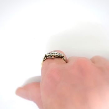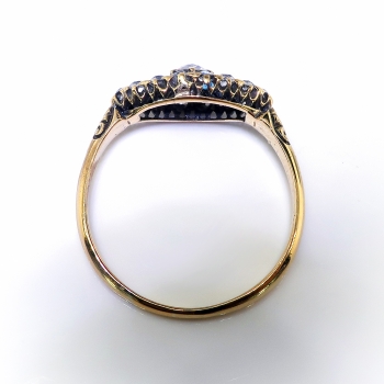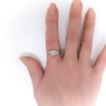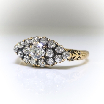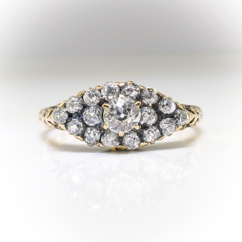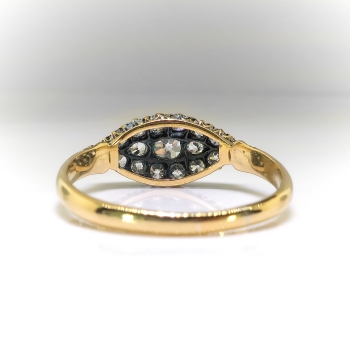 This is such an unusual and blinding antique diamond ring from the late 19th century! It also resembles the 'Evil Eye' motif if you look closely! So many diamonds in such a delicate ring! A circa 1880's Victorian diamond ring made in 18k yellow gold with glittering antique cut diamonds with European origin. The ring comprises one old European cut diamond surrounded by sixteen smaller Old European cut diamonds within a marquise-shaped mounting measuring 16.52 x 8.00 x 4.14 mm, on a half-round shank which measures from 1.88 to 3.40 mm in width. The center diamond is VS1 in clarity, I-J in color, measures approximately 4.04 – 4.28 x 2.61 mm, and weighs approximately 0.29 carat. The smaller diamonds are VS1-SI1 in clarity [three are chipped], G-I in color, measure from approximately 2.23 to 2.42 mm, weigh from approximately 0.04 to 0.05 carat each, and have an approximate total weight of 0.66 carat. Approximate total gem weight: 0.95 carat. The ring is stamped “18 CT”, weighs 3 grams and is currently a finger size 9.75. This ring can go up to any size and down to a 6. I can have my trusted jeweler safely re-size this for a flat $45 gold sizing fee, just message me prior to checking out so I can adjust the price. I can send you a current retail replacement appraisal upon completion of sale, just ask! Questions are welcomed on Ring-2359.