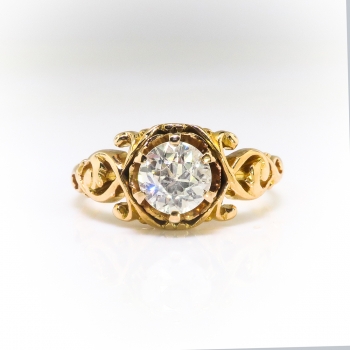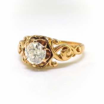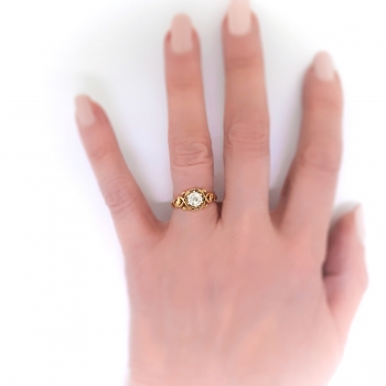 A true Art Nouveau era old European cut diamond engagement ring for the antique jewelry lover! Not only is it unique, but it the diamond appears MUCH larger in this elaborate scrolly solitaire mounting from the early 20th century! A stunning and rare Art Nouveau solitaire (US origin) that comprises a single Old European cut diamond set in a six-prong mounting at the center of an open scrollwork motif shank which measures from 1.41mm to 8.09mm wide. This blinding antique cut diamond has the quality grade range of SI2 (eye clean) in clarity, H-I in color, measures approximately 5.30 – 5.36 x 3.43 mm, and weighs approximately 0.62 carats. The ring is stamped “18K” and has been entirely tested and guaranteed to be 18k yellow gold, weighs 2.9 grams, and is currently a finger size 5. I will be more than happy to have my trusted jeweler safely re-size this ring for a flat $45 gold sizing fee, just ask! Ring re-sizing takes an additional 3-7 business days by a third party Master Bench Jeweler, not to worry! Your ring is in good hands! I will be more than happy to email this piece's current certified and guaranteed retail replacement appraisal upon completion of sale, just ask! Questions are welcomed on Ring-2483.