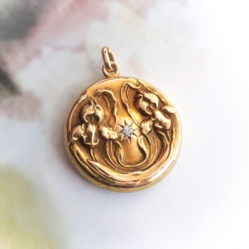 Jewelry Finds Archive Antique Diamond Locket Pendant Circa 1900's .03ct Old European Cut Art Nouveau Iris Floral Pendant 10k Yellow Gold