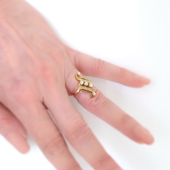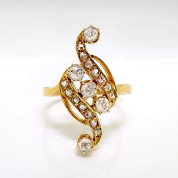 This is a piece to own and wear every day for any occasion! A true Art Nouveau era diamond ring made entirely in 18k yellow gold (tested and guaranteed). The ring measures 22.97mm x 11.80mm over all and comprises an open swirl motif prong-set with five old European cut diamonds and bead-set with 14 round rose cut diamonds, on a flat shank which measures 1.80mm wide. The diamonds have the quality grade range of H-I color, SI1-I2 in clarity. The five old European cut diamonds measure an approximate average of 2.90mm in diameter, and weigh approximately .09cts each (.45ct t.w.). The adorning round rose cut diamonds measure an approximate average of 1.70mm in diameter, and weigh approximately .02cts each. This outstanding Art Nouveau diamond ring has a grand total weight of approximately .73ct t.w.. This ring is unmarked, weighs 3.3 grams, and is currently a finger size 6. Jewelry Finds® additional sizing up or down will be determined on a case by case basis so please inquire :). Ring re-sizing takes an additional 3-7 business days by a third party Master Bench Jeweler, not to worry! Your ring is in good hands! I will be more than happy to email this piece's current certified and guaranteed retail replacement appraisal upon completion of sale, just ask! Questions are welcomed on Ring-2116.