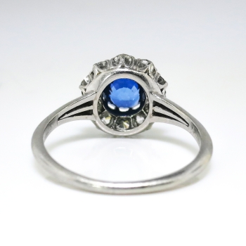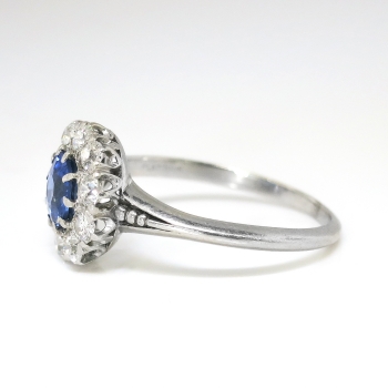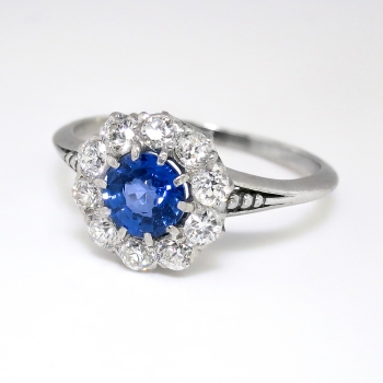 This ring is absolutely incredible!!! Photos truly cannot capture the beauty of this antique gem, Circa 1915. This natural sapphire and diamond ring is in wonderful condition and will be the perfect ring to adorn ANY finger. I love this precious ring!!! The inside of the shank is stamped '819709 SHREVE & CO. PLATINUM', with a serial number and designer stamp from world renowned 'Shreve & Co. San Francisco California'. The ring comprises a round mixed cut sapphire set in ten prongs, surrounded by ten old European and transitional cut diamonds on a knife-edge shank, the shoulders of which have a beaded detail, and which measures from 1.37 to 3.39 mm in width. The central ceylon bright blue hued natural sapphire measures approximately 5.20mm x 5.23mm x 2.95mm and weighs approximately .43cts. The surrounding glittering old cut diamonds are graded G-I color, VS2-SI2 clarity, and have a combined diamond carat weight of approximately .40ct t.w.. This ring measures 10.4mm in diameter and is raised subtly 4mm off the finger. This ring is made entirely in platinum, weighs 3.1 grams, is currently a finger size 5.5 and my trusted jeweler can safely re-size this up to four sizes or down to two sizes free of charge, just ask! I will be more than happy to email a certified retail insurance replacement appraisal upon completion of sale, just ask! Layaway and questions are welcomed on Ring-1571.