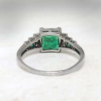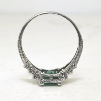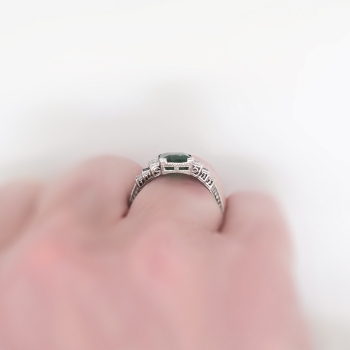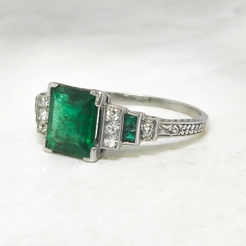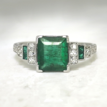 This Edwardian 1920's emerald and diamond ring is romantic, elegant, and ornate without being too busy. It has just enough hand engraving and accent stones to make this ring stand out from all the rest! This ring features a 1.52ct natural baguette cut emerald. That gemstone measures 7.69mm x 6.72mm x 4mm and is safely set in platinum! That beautiful gemstone is adorned by French cut lab emeralds and old European cut diamonds with the quality grade range of H-I color, VS2-SI1 clarity. The emeralds have an accumulative size weight of approximately .10cts, and the diamonds an accumulative carat weight of .16ct t.w.. This ring has a grand gemstone and diamond weight of approximately 1.78ct t.w.. The ring measures 8mm North to South, 15.7mm East to West, and is raised subtly off the finger 3.5mm tall. It is stamped “10% IRIDPL” meaning it has the standard antique platinum mixture of 10% iridium and 90% platinum. This ring weighs 3.1 grams, is currently a finger size 7.75, and my trusted jeweler can safely re-size this up to three sizes or down to two sizes free of charge, just ask! Layaway and questions are welcomed on this remarkable Edwardian ring, Ring-1582.