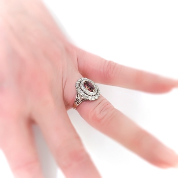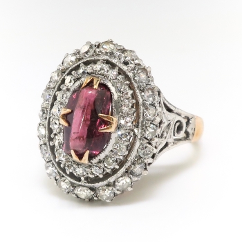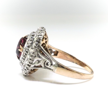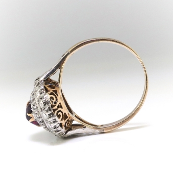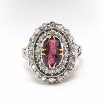 I'm delighted to offer this stunning antique treasure of a ring from the early 20th century of 14k yellow gold, silver, natural rhodolite garnet, and old diamonds. It is made up of a native cabochon cut rhodolite garnet, set in four yellow gold double prongs, within a silver, millegrain-edged, oval double halo mounting measuring 16.21 x 12.56 mm, prong-set with thirty-eight single cut diamonds, atop a yellow gold scrollwork gallery, on a flat yellow gold shank with silver scrollwork shoulders, which measures from 1.19 to 3.16 mm in width. The garnet measures approximately 6.75 x 4.50 x 3.30 mm, and weighs approximately 1.06 carats. The diamonds are SI1-SI2 in clarity, H-I in color, measure from approximately 1.20 to 1.68 mm in diameter, weigh from approximately .01 to .02 carats each, and have an approximate total weight of .58 carats. Approximate total gem weight: 1.64 carats. The ring is unmarked. Total weight: 3.3 grams. It is currently a size 5.25 and is resizable. Jewelry Finds® additional sizing up or down will be determined on a case by case basis so please inquire :). Ring re-sizing takes an additional 3-7 business days by a third party Master Jeweler. I will be more than happy to email this piece's current retail replacement appraisal upon completion of sale, just ask! Questions are welcomed on Ring-2186