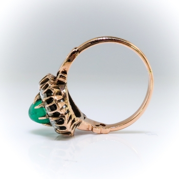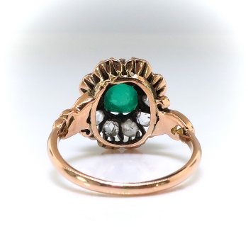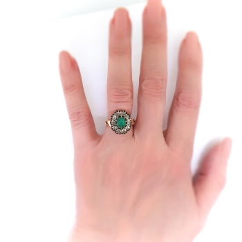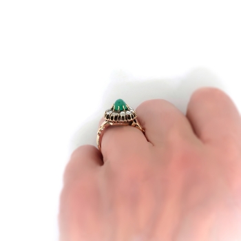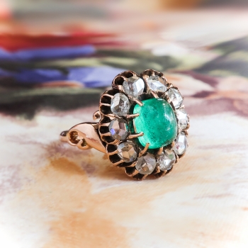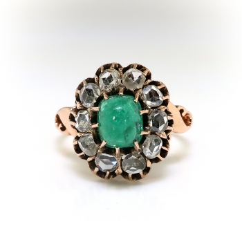 I'm awe struck with this regal antique cabochon natural emerald and rose cut diamond halo ring in luxurious rose gold! This ring was made in the early 20th century, and is made in 10k rose gold, a natural fine cabochon green emerald, and antique rose cut diamond ring. The ring comprises a cushion cabochon cut emerald prong-set surrounded by 10 round glittering rose cut diamonds prong-set within an oval buttercup mounting measuring 15.32 x 13.80 mm, on a half-round shank with scrolled shoulders, measuring 1.90 mm in width. The emerald is moderately included, measures approximately 6.47 x 5.63 x 4.17 mm, and weighs approximately 1.20 carats. The diamonds are SI1-SI2 in clarity, H-I in color, measure an approximate average of 3.07 mm in diameter, and weigh approximately 0.04 carat each. This ring has a big look with it's chunky rose cut diamond halo, with a grand total gemstone and diamond weight being approximately 1.60ct t.w.. This ring weighs 4 grams, is currently a finger size 7.25, and I can have my trusted jeweler re-size this for you for a flat $45 gold sizing fee and will take an additional 3-7 business days, just ask! I can also email this piece's current retail replacement appraisal upon completion of sale, please inquire. Questions are welcomed on Ring-2422.