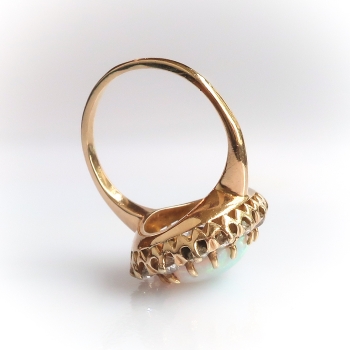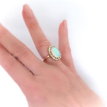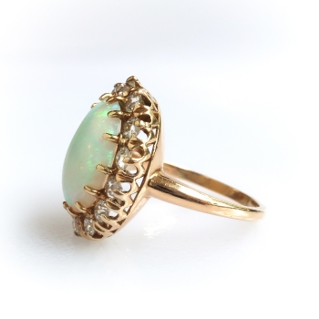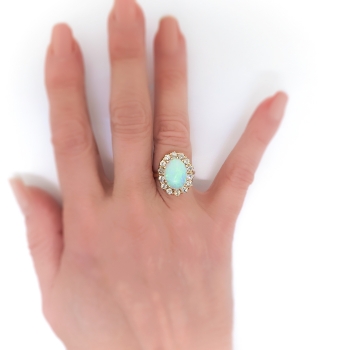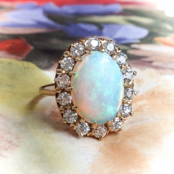 This extraordinary and rare enormous Australian crystal solid natural opal and old European cut diamond halo find is the perfect ring if you adore opals or if it's your birthstone (October)... or you just can't resist huge glittering antique cut diamonds surrounding a rainbow of colors on your finger. This ring is a 14k yellow gold, crystal opal, and diamond ring, of hand-made construction, circa early 20th century. The ring comprises an oval cabochon cut opal surrounded by 14 Old European cut diamonds, forming an oval mounting measuring 20.20 x 16.22 x 8.08 mm, on a half-round shank which measures from 1.58 to 3.18 mm in width. The opal displays green and blue pinfire play-of-color, measures approximately 13.88 x 10.46 x 4.54 mm, and weighs approximately 3.68 carats. The diamonds are SI1-I2 in clarity, H-I in color, measure an approximate average of 2.87 mm in diameter, and weigh approximately 0.09 carat each. Approximate total gem weight: 4.94 carats. The ring is stamped “14” and is currently a finger size 7. Total weight: 5.5 grams and is resizable, shoot me a message prior to checking out to have it sized for a flat $45 gold sizing fee. Ring re-sizing takes an additional 3-7 business days by a third party Master Jeweler! I will be more than happy to email this piece's current retail replacement appraisal upon completion of sale, just ask! Questions are welcomed on Ring-2417.