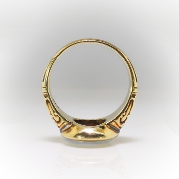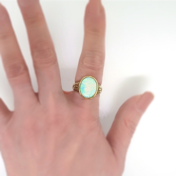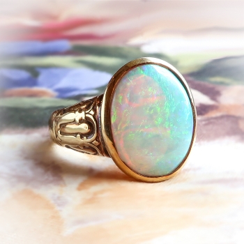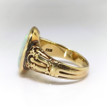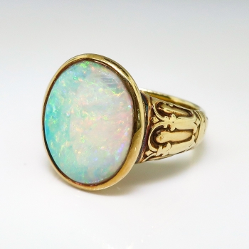 What a fun and bold Art Nouveau/Arts & Crafts ring created by the jewelry house 'JONES & WOODLAND' an earlier company out of Newark, New Jersey bought by large jewelry house 'Krementz' in the late 1930's. 'Jones & Woodland' spanned the 19th, 20th and 21st centuries from 1896 until 1938! But this ring is clearly an late 1800's-early 1900's Arts & Crafts/Art Nouveau era piece of art. The axe symbol sure was difficult to find but these hallmark books sure do help! This ring features an incredible bezel set fiery white opal (solid and in perfect condition after all these years!) and measures 15mm x 12.45mm and approximately 2.75mm thick. That opal has bright play of color and no inclusions. It's simply magical! This gemstone weighs approximately 3.20cts (but could weigh more due to the heavy bezel). The ring measures 17mm North to South, 22mm East to West, and is raised 4.5mm off the finger. This unisex ring weighs a whopping 9.60 grams, is currently a finger size 8.5, and my trusted jeweler can safely re-size this up or down two sizes free of charge, just ask (additional sizes up from a 10.5 will be a flat $45.00 gold fee, just ask). The original patina remains if unsized (the shadows that lurk from the past!) but if re-sized they will be polished and regain a new natural patina over time. This ring is made entirely in stamped and guaranteed 14k yellow with a hint of green gold. It looks amazing as a pointer finger! Questions are welcomed on this remarkable antique ring, Ring-1894.