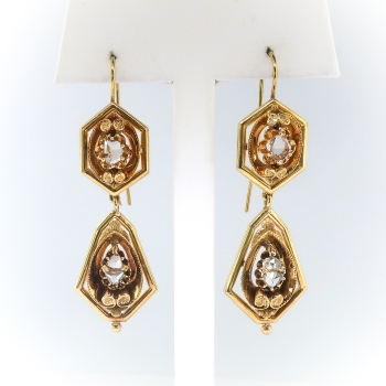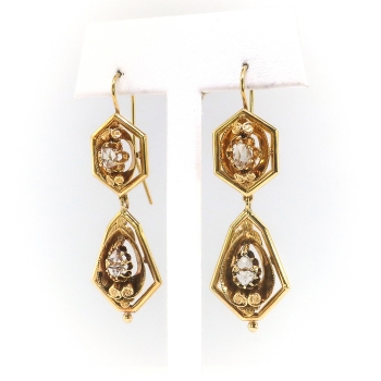 These miraculous antique rose cut diamond chandelier earrings won't last long! A beautiful heirloom pair of 22k yellow gold and diamond earrings, of hand-made construction, circa 1890's. Each earring measures 2 ¼” long by approximately 1/2" inch wide and comprises a hexagonal mounting holding a center oval mounting prong-set at the center with one oval rose cut diamond, fixed on a French hook earring back, from which is suspended a bell-shaped mounting holding a pear-shaped mounting prong-set at the center with two triangular rose cut diamonds. The diamonds are SI2-I1 in clarity and J-K in color. The two oval rose cut diamonds measure approximately 5.21 x 4.09 mm and 5.45 x 3.98 mm, and weigh approximately 0.23 carat each. The four smaller diamonds measure from approximately 3.61 x 2.80 mm to 4.08 x 3.04 mm, weigh from approximately 0.07 to 0.10 carat each, and have an approximate total weight of 0.34 carat. Approximate total gem weight: 0.80 carat. The earrings are unmarked. Total weight: 10.9 grams. These are for pierced ears only and are light enough to wear comfortably day to night! Questions are welcomed on Earrings-2434.