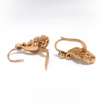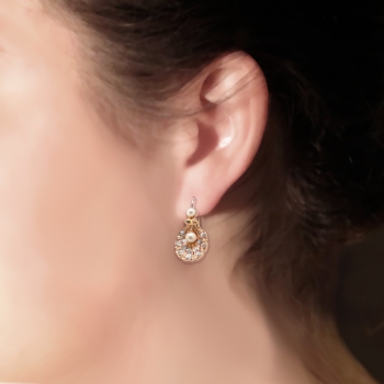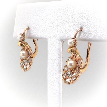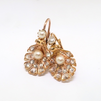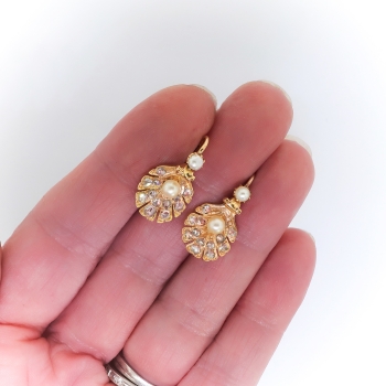 Show your love of the sea with these antique pearl and shell earrings. 18k yellow gold, diamond, and natural pearl [visual identification only] shell motif earrings, handmade from the early 20th century. Each earring measures approximately 19.50 x 11.97 mm and comprises a shell-shaped mounting suspended from a lever-back earring finding, prong-set with one button pearl, the shell set with one round pearl and bead-set with twelve round rose cut diamonds. The pearls are cream in color, measure from approximately 2.80 to 3.95 mm in diameter, have good luster, and are clean to lightly blemished. The twenty-four diamonds are SI2-I1 in clarity, I-J in color, measure from approximately 1.98 to 2.87 mm in diameter, weigh from approximately .01 to .06 carats each, and have an approximate total weight of .64 carats. The earrings are unmarked. Total weight: 5.1 grams. Questions are welcome for 2189-earrings.