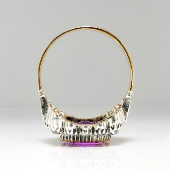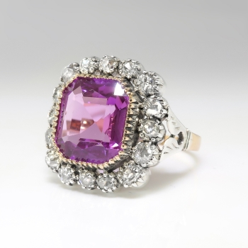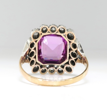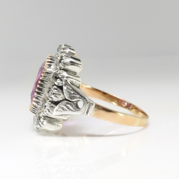 Oh my goodness how is this a lab created gemstone ring? The color is sensational and this ring as a whole is in excellent antique condition. A big, bold, and beautiful synthetic lab created pink sapphire ring (all original!) has a gorgeous shape, measures approximately 11.19mm x 10.01mm x 4.63mm, and weighs approximately 4.58 carats. The synthetic pink sapphire is eye clean, color: R2P50/10% Black Mask, displays 50% brilliance. That stone is adorned by a halo of old mine cut diamonds set in sterling silver (era appropriate of silver over gold). This shank is a beautiful 18k rose-yellow gold and was made in the early-20th century (late Art Nouveau/Early Edwardian era). The ring measures 18.13mm x 17.47mm x 5.47mm over all, and comprises a square octagonal modified cushion cut synthetic pink sapphire, set in a yellow gold bezel, surrounded by individually prong-set old mine cut and old European cut diamonds atop a shank which measures from 1.97mm to 2.60mm in width. The 16 glittering antique cut diamonds have the quality grade range of G-I color, SI1-SI2 clarity, measure approximately 2.55mm each and weigh .06cts each for a grand total diamond weight in this ring weighing approximately .96ct t.w.. This ring has an outstanding grand total gemstone and diamond weight being 5.54ct t.w.. This ring has been tested entirely top to bottom and has it's worn hallmark due to age, but is sterling silver top over 18k bottom. The perfect antique two tone cocktail ring with the rarest pink color! This ring 6.3 grams and is currently a finger size 10. Jewelry Finds® additional sizing up or down will be determined on a case by case basis so please inquire :). Ring re-sizing takes an additional 3-7 business days by a third party Master Jeweler. I will be more than happy to email this piece's current retail replacement appraisal upon completion of sale, just ask! Questions are welcomed on Ring-1953