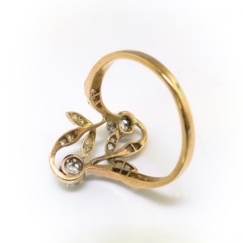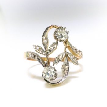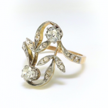 A beautiful trinket from the Victorian era to wear as an alternate 'Toi Et Moi' engagement ring, or if you simply love two tone antique rings! A 18k yellow gold, silver, and diamond ring, of hand-made construction, circa 1890's. The ring comprises two conjoined floral motifs forming an oval mounting measuring 16.68 x 12.78 mm, prong-set with two old European cut diamonds and bead-set within the leaf-shaped mountings with 18 round rose cut diamonds, all in silver-topped yellow gold, on a flat shank which measures from 1.31 to 1.92 mm in width. The old European cut diamonds are SI1-SI2 in clarity, I-J in color, measure from approximately 3.23 to 3.40 mm in diameter, and weigh approximately 0.12 and 0.14 carats each. The round rose cut diamonds are SI1-I1 in clarity, I-K in color, measure from approximately 1.00 to 1.52 mm in diameter, weigh from approximately 0.005 to 0.01 carat each, and have an approximate total weight of 0.13 carats. Approximate total gem weight: 0.39 carat. The ring is stamped “18K” with sterling silver top, weighs 2.4 grams, and is currently a finger size 5.5. I will be more than happy to have my trusted jeweler safely re-size this ring free of charge, just ask! Ring re-sizing takes an additional 3-7 business days by a third party Master Bench Jeweler, not to worry! Your ring is in good hands! I will be more than happy to email this piece's current retail replacement appraisal upon completion of sale, just ask! Questions are welcomed on Ring-2468.