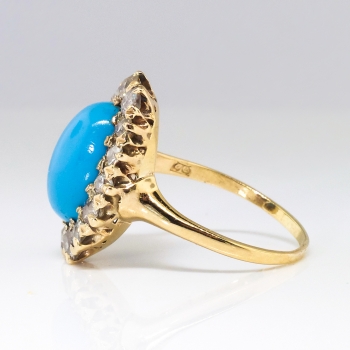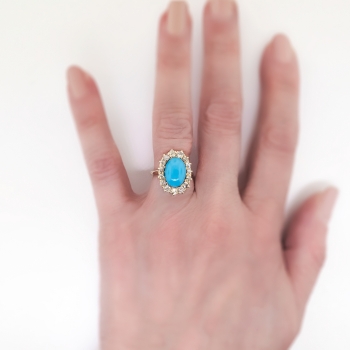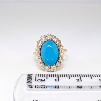 This extraordinary Victorian era natural turquoise and blinding old European cut diamond cocktail ring has that 'wow' factor you have been searching for! Everything from it's very rare central oval cabochon blue turquoise (newly polished and just gorgeous!) to it's chunky old European cut diamond halo. This ring features a central natural turquoise that weighs approximately 3.05cts and measures 11.87mm x 8.40mm. That gemstone is adorned by 15 chunky old European cut diamonds that have the quality range of H-J color, VS2-SI2 clarity, and a total diamond weight of approximately 1.01ct t.w.. This ring has a grand total gemstone and diamond weight of 4.06ct t.w.. This ring measures 18.63mm North to South, 13.65mm East to West, and is raised regally 7.5mm off the finger. This special antique ring is made in 14k yellow gold (stamped) weighs 4.1 grams, is currently a finger size 6 and my trusted jeweler can safely re-size this up or down two sizes free of charge and will take 1-5 business days, just ask (additional sizes up will be a flat $45.00 gold fee, just ask!). I will be more than happy to email a certified retail insurance replacement appraisal upon completion of sale, just ask! Don't miss out on this one of a kind ring and message me to start your layaway TODAY! Questions are welcomed on Ring-1728.