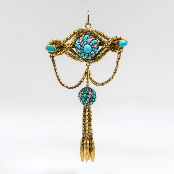 Gemstone: Diamond, Turquoise Metal: 18k Yellow Gold, Sterling Silver Items: Pendants, Pins/Brooches