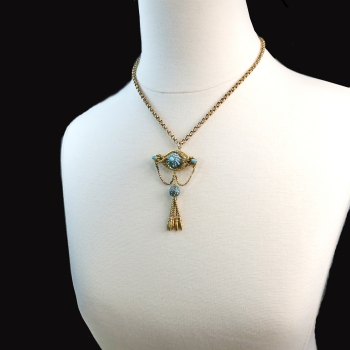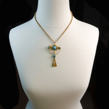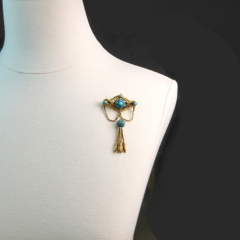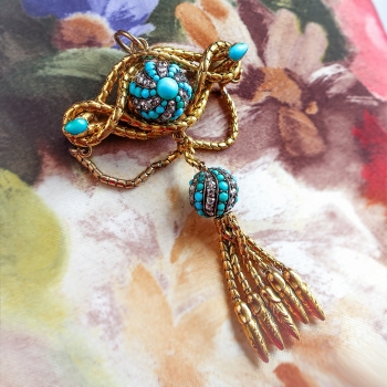 This is a once in a lifetime piece! I am proud to present this authentic and extremely rare Victorian turquoise and old mine cut diamond tassel brooch/pendant. It is the kind of piece that is featured in antique jewelry books and will be your absolute favorite treasure! I even love just holding it because it's such a rare and precious piece of art! It almost has a regal 'YSL' look to it but for fine antique jewelry lovers! It's a stunning Victorian (Circa 1880's) brooch featuring a unique, detailed design with rich embellishments. Whether pinned to a garment or worn as a pendant, this gorgeous accessory adds an interesting, upscale element to any look. This swirling and transcendent piece features 68 natural cabochon turquoise in excellent condition totaling approximately 2cts and an additional 65 bead set old mine cut diamonds set in sterling silver ( .57ct t.w. G-H color, SI1-I1 clarity range). This brooch/pendant has an approximate grand total gemstone and diamond weight being 2.57ct t.w.. This pin is made with with c-clasp closure and Jump ring and I have included a FREE European antique gold chain so you may have the immediate option to wear it as an extraordinary pendant so you can use this chain for other pendants as well! My treat! It is an antique English origin solid 9k rose-yellow gold chain that is beautifully made, with hand hammered links, and fastened with a tiny dog clip fastener. Some signs of wear & faint shallow denting to a few links commensurate with age and use. The chain is Circa 1880's and stamped '9ct'. The chain measures 18 inches long and weighs 8.3 grams on it's own. The pendant weighs 17.5 grams of 18k yellow gold and sterling silver holding the sensational old mine cut diamonds (all gems, metals and diamonds are tested and guaranteed). It measures 3" inches North to South, 1.75 inches East to West, and has the faint unidentified maker's mark of 'N.H. 1287CQ'. In total, this piece weighs 25.8 grams and is in excellent antique condition! Questions are welcomed on Pendant-1875.