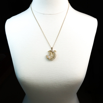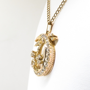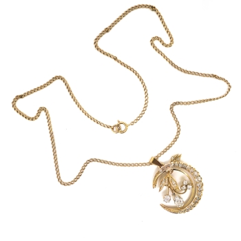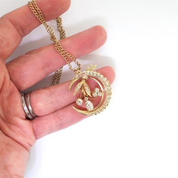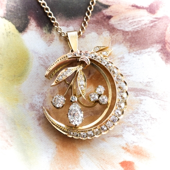 No, you are not dreaming! That is a true antique mine cut PEAR shaped diamond in an era appropriate crescent design! This entirely tested and guaranteed 18k yellow gold moon and clover motif pendant, of hand-made construction, circa early-20th century. The pendant measures 1 ¼” diameter and comprises a moon-shaped mounting bead-set throughout with Old European and Old Mine cut diamonds, at the center of which is a flower and leaf motif prong- and bead-set with pear and Old European cut diamonds, suspended from a tapered, polished bail. The pear cut diamond is SI1 in clarity, I-J in color, measures approximately 7.11 x 4.69 x (2.81) mm, and weighs approximately .56 carats. One old European cut diamond is VS2 in clarity, I-J in color, measures approximately 4.30 x 4.30 x (2.58) mm, and weighs approximately .31 carats. The thirty-four smaller Old European and Old Mine cut diamonds are VS2-SI2 in clarity, I-J in color, measure from approximately 1.70 to 3.79 mm in diameter, weigh from approximately .02 to .20 carats each, and have an approximate total weight of 1.96 carats. The pendant has a whole has a grand total diamond weight being 2.83ct t.w.. The bail is stamped “750”. Total weight: 8.5 grams. The free 14k solid gold 20" inch cable link chain measures 2.10mm wide and terminates in a spring ring clasp, and is stamped “14K”. Total weight: 5.1 grams. This necklace as a whole weighs 13.6 grams.