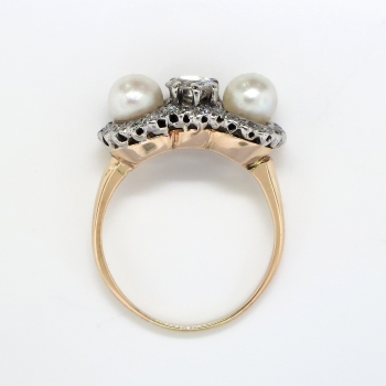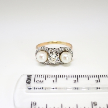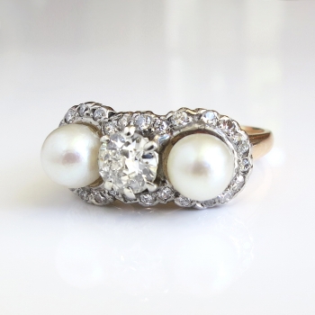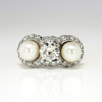 This rare and romantic 1920's natural cultured pearl and old European cut diamond ring has elegance, charm and brilliance! It would make a special ring to wear on your wedding day as pearls are a bride's go-to accessory! This ring features a central old European cut diamond weighing .49 cts. That diamond is graded J color, VS2 clarity. On either side of that diamond are two 5.5-6mm cultured pearls that have a creamy luster and are slightly off round. In addition are 26 .01ct old European cut and single cut diamonds that are graded J color, SI1-SI2 clarity. This ring has a grand total diamond weight of approximately .75ct t.w.. This ring measures 9.5mm North to South, 19.5mm East to West, and is raised 9mm off the finger. This ring is made in tested and guaranteed 14k yellow gold with platinum prongs, weighs 5.5 grams, and is currently a finger size 8. Jewelry Finds® offers complimentary ring re-sizing + or - 2 sizes! The cost of additional sizing up or down will be determined on a case by case basis so please inquire :). Ring re-sizing takes an additional 1-5 business days. I will be more than happy to email this ring's current certified and guaranteed retail replacement appraisal upon completion of sale, just ask! Questions are welcomed on Ring-1726.