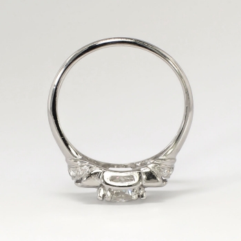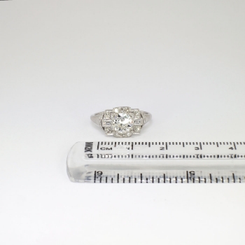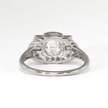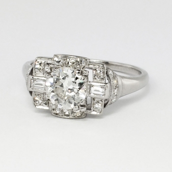 This geometrically elegant 1930's Art Deco engagement ring is comprised of a central sparkling old European cut diamond weighing .76cts that is adorned with .33cts in accent diamonds. The mounting is perfect for this lovely bright and white antique cut diamond! The central diamond has the quality grade of H color, SI2 clarity with expected wear to the girdle of the diamond and completely eye clean and brilliant. That diamond is adorned by the two .03ct bezel set baguette diamonds with the quality range of H/SI1 clarity, 10 .02ct single cut diamonds with the quality range of H-I color, SI1 clarity, and 10 .005ct diamonds with the quality range of H-I color, SI1 clarity. The half-round shank tapers from 3.26mm to 1.26mm in width. This amazing ring has a grand total carat weight of approximately 1.07ct t.w.. This ring measures 9mm North to South, 14mm East to West, and is raised 5mm high. The ring is made entirely in platinum, weighs 3.6 grams, and is currently a finger size 5.5. This ring can easily be re-sized up three sizes or down two sizes by my trusted jeweler, just ask! I will be more than happy to type a replacement appraisal upon completion of sale, just ask! Questions are welcomed on Ring-1498.