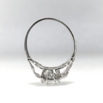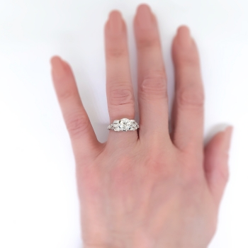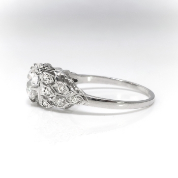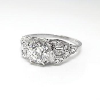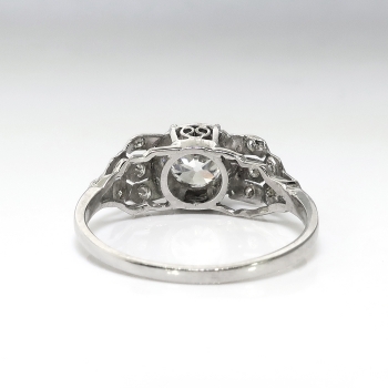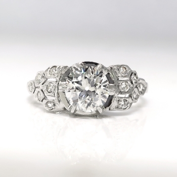 Her heart will sing when she sees this glittering Art Deco platinum and diamond engagement ring, of hand-made construction, circa 1930’s. The ring comprises an Old European cut diamond set in a six-prong mounting, flanked by twelve round brilliant cut diamonds surface-prong-set within miligrain-edged, geometric frames on the shoulders of the flat shank, which measures from 1.21 to 1.87 mm in width and 6.60mm high off the finger. The diamond is VS2 in clarity, G-H in color, measures approximately 6.14 – 6.27 x 3.75 mm, and weighs approximately .98 carats. The smaller diamonds are SI1-SI2 in clarity, I-J in color, cut grade: fair to good, measure an approximate average of 1.45 mm in diameter, and weigh approximately .01 carats each. Approximate total gem weight or this stunning ring is 1.10 carats. The ring is unmarked. This ring weighs 3 grams and is currently a size 7 US. Jewelry Finds® additional sizing up or down will be determined on a case by case basis so please inquire :). Ring re-sizing takes an additional 3-7 business days by a third party Master Bench Jeweler, not to worry! Your ring is in good hands! I will be more than happy to email this piece's current certified and guaranteed retail replacement appraisal upon completion of sale. Questions are welcomed on 2168-Ring.