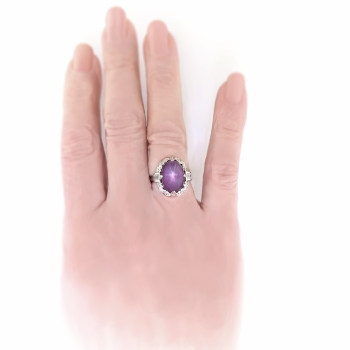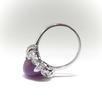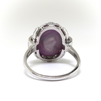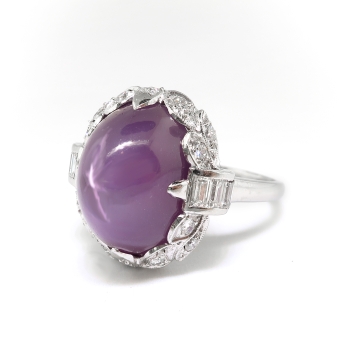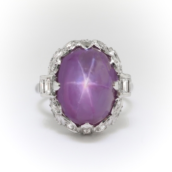 Found is this lovely Art Deco pinkish-purple star sapphire and diamond platinum ring. It contains one natural, oval star sapphire cabochon of approx. 13.65cts. of a unique, pink/purple color with a 6-ray star (asterism) in direct light. The setting is made with six baguette diamonds (approx. .25cts, VS1-VS2 Clarity, G-H Color) and 14 single cut diamonds (approx. .21cts., VS1-VS2 Clairty S-H Color). The sapphire is set in four prongs, two with a single cut and two with 3 channel set baguettes. the baguettes are at the sides and there are seven single cuts in leaves around the ends, including the two prongs. The top measures 16.47 mm long by 15.80 mm wide. The shank measures 1.54 mm wide by 1.12 mm thick at the bottom and 2.54 mm wide at the top. The ring is stamped "JBH" (J. B. Hudson Company, Minneapolis, MN, founded 1886.), 10% IRID PLAT. The ring weighs 8 grams and is currently a size 6.75 and resizable (contact us for options). Questions are welcome for Ring 3228.