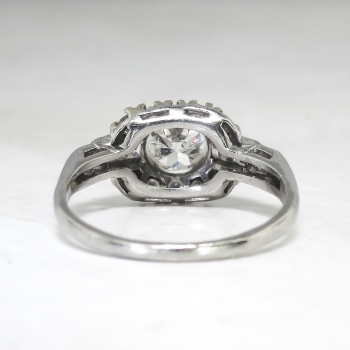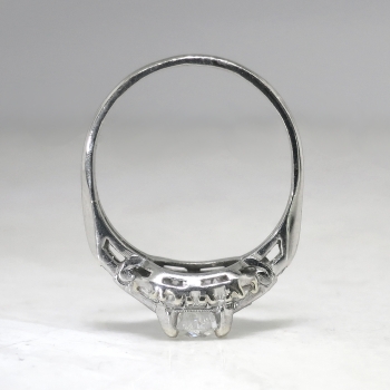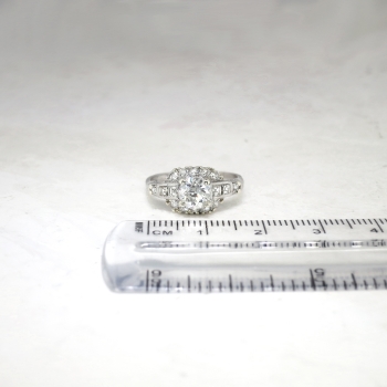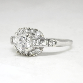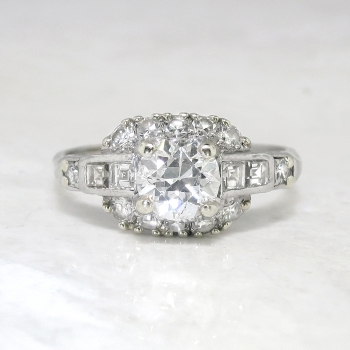 This is a blinding 1930's glitter bomb at an affordable value, only from Jewelry Finds! This ring has every element you would want in a vintage diamond engagement/anniversary ring. This ring features an approximate .75ct central old European cut diamond measuring 5.85mm in diameter, and having the quality grade of J color, SI2-I1 clarity ( diamond has expected wear from age but does not compromise the durability and is eye clean!). I hand select everything- not to worry! That glorious diamond is set in an ornate late 1930's diamond setting in platinum with 14k white gold prongs. That mounting is set with four asscher cut diamonds (.16ct t.w., I color, SI1 clarity), and 12 bead set single cut diamonds ( .33ct t.w., I color, SI1 clarity). This ring has a grand total diamond weight of approximately 1.24ct t.w. The ring measures 8.83mm North to South, 17.75mm East to West, and is raised 6.3mm off the finger. This ring is stamped 'PLATINUM', weighs 3.70 grams, and is currently a finger size 6.25. My trusted jeweler can safely re-size this up or down four sizes, just ask! This mounting is over 80 years old with expected wear, so please inquire if you would like the prongs re-tipped in platinum by my jeweler. Personally, I love the charm of these old rings!!! It has not been polished yet to maintain it's integrity, so image how gorgeous it will be when it is! I will be more than happy to email a certified retail insurance replacement appraisal upon completion of sale, please inquire. Questions are welcomed on Ring-1592.