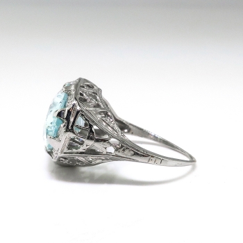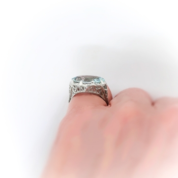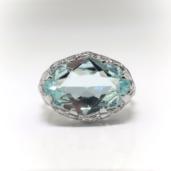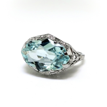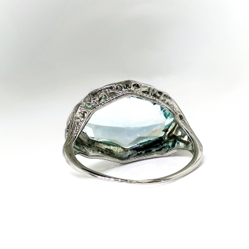 This ring is so special and unusual with it's fancy antique cut ice blue aquamarine and elaborate filigree. The fun antique marquise mixed cut aquamarine is an usual shape and no one will have this ring! It doesn't even need diamonds! This superb 1930's US origin ring is a true gem at a wonderful value, only from Jewelry Finds®! The nearly antique (antique means 100+ years or older, vintage means 20+ years or older, estate means pre-owned) ring comprises a 18k white gold and aquamarine beryl ring, of hand-made construction, circa 1930’s. The ring comprises a modified oval mixed cut aquamarine prong-set at the center of a filigree mounting, on a shank which measures from 0.47 to 1.51 mm in width. The aquamarine is eye clean, measures approximately 14.98 x 9.87 x 5.27 mm, and weighs approximately 4.45 carats. The ring is stamped “18” and is tested and guaranteed 18k white gold. This ring weighs 3.1 grams, is currently a finger size 4 and Jewelry Finds® additional sizing up or down will take an additional 3-7 business days by a third party Master Jeweler and will cost a flat $75.00 for this ring, just shoot me your finger size if you check out! Your ring is in good hands! I will be more than happy to email this piece's current certified and guaranteed retail replacement appraisal upon completion of sale, just ask! Questions are welcomed on Ring-2227.