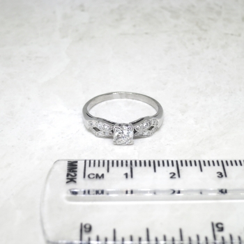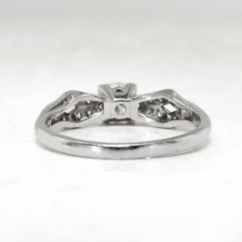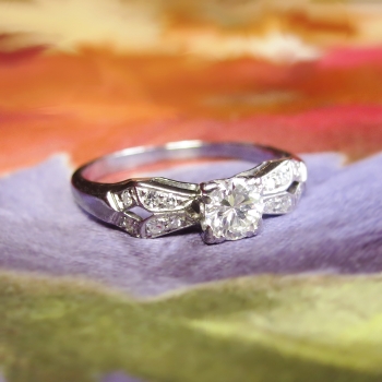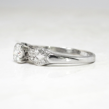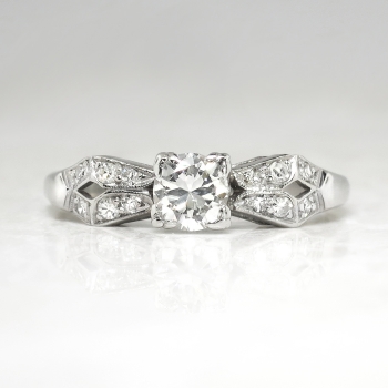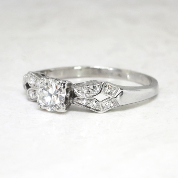 What a wonderful vintage engagement ring from the 1930's! It really is a special sparkler with a unique design! This ring features an approximate .34ct central old transitional cut diamond measuring 4.65mm in diameter, and having the quality grade of H color, VS2 clarity. It is very fiery and eye clean! That glorious diamond is set in an ornate late 1930's diamond setting in platinum. That mounting is set with 12 .01ct old single cut diamonds that have the quality grade of H color, VS2 clarity. This ring has a grand total diamond weight of approximately .46ct t.w. The ring measures 4.8mm North to South, 18.75mm East to West, and is raised a subtle 4.4mm off the finger. This ring is tested and guaranteed platinum with a 10k white gold shank (can be re-shanked for a flat $150.00 fee), weighs 3.10 grams, and is currently a finger size 6.25. My trusted jeweler can safely re-size this up or down to any size free of charge as is, just ask! I will be more than happy to email a certified retail insurance replacement appraisal upon completion of sale, just ask! Layaway and questions are welcomed on Ring-1596.