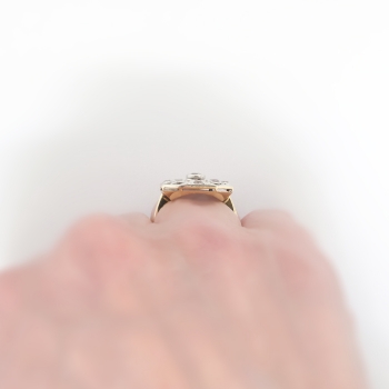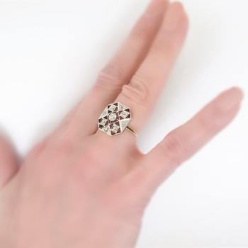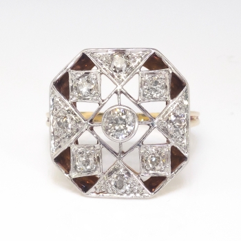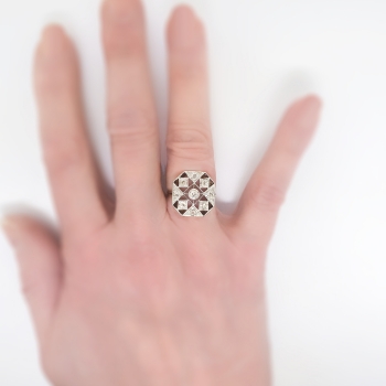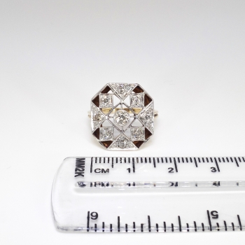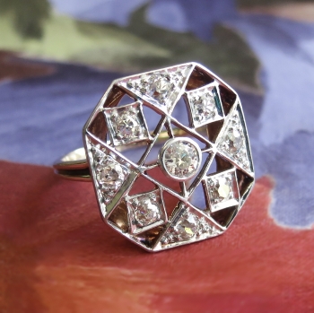 What a showstopper! This circa 1930's statement ring has geometrical elegance at every angle! The old European cut diamonds are superb, the design unique, and the size is HUGE! If you love big rings from our past, this ones for you! This ring measures 17mm North to South, 15.81mm East to West, and is raised subtly 4mm off the finger. The ribbed 14k yellow gold shank tapers from 2.15mm to 1.30mm. The diamonds are set in platinum and the shank is 14k yellow gold (tested and guaranteed). This ring features nine old European cut diamonds graded J-L color, SI1-SI2 clarity, and a combined total diamond weight of approximately .66ct t.w.. The center diamond weighs .15cts and the surrounding diamonds weigh between .04cts-.05cts each. This ring is currently a finger size 5.75 and my trusted jeweler can size this up or down two sizes free of charge, just ask (any additional sizes up are a flat $45.00 gold fee, just ask!). This ring weighs 3.6 grams and is in excellent vintage condition (80+ years old!). I will be more than happy to type up a certified retail insurance replacement appraisal upon completion of sale, just ask! Layaway and questions are welcomed on this fun and gorgeous Art Deco bauble, Ring-1632.