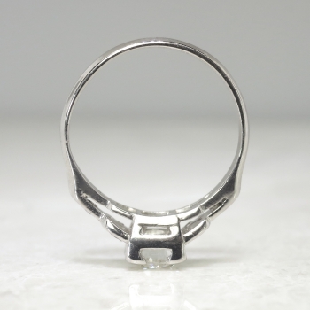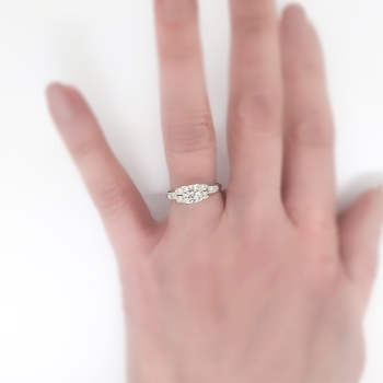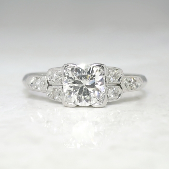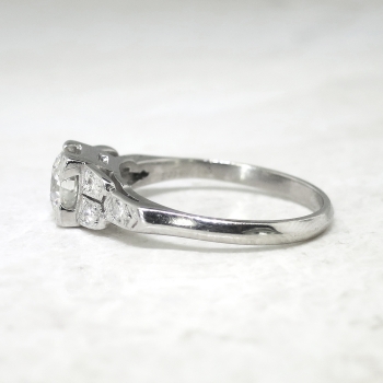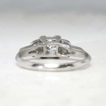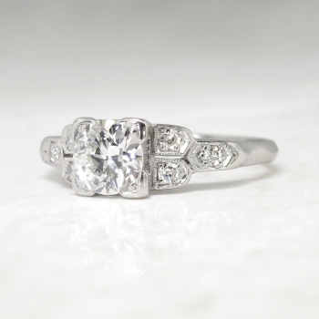 This platinum and diamond engagement ring is timeless! I see rings being made today in this particular Art Deco style, but acquire the real thing here! There is no comparison to a romantic authentic Art Deco engagement ring! This ring features an approximate .66ct central late old European cut diamond that has the quality grade of K color, VS1 clarity. That glorious diamond is set in an elegant late 1930's diamond setting in platinum that is set with six bead set single cut diamonds ( .12ct t.w., I color, SI1 clarity). This ring has a grand total diamond weight of approximately .77ct t.w. The ring measures 5.6mm North to South, 17mm East to West, and is raised 5.38mm off the finger. This ring is stamped 'PLAT', weighs 3.50 grams, and is currently a finger size 5.75. My trusted jeweler can safely re-size this up to four sizes or down to two sizes, just ask! I will be more than happy to email a certified retail insurance replacement appraisal upon completion of sale, please inquire. Layaway and questions are welcomed on Ring-1587.