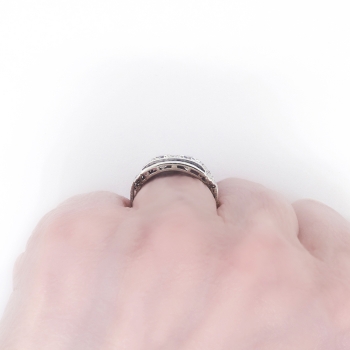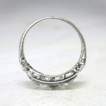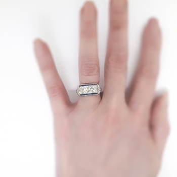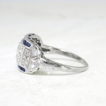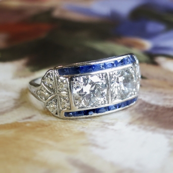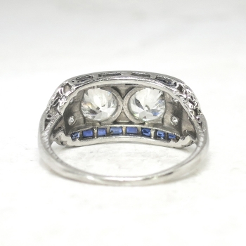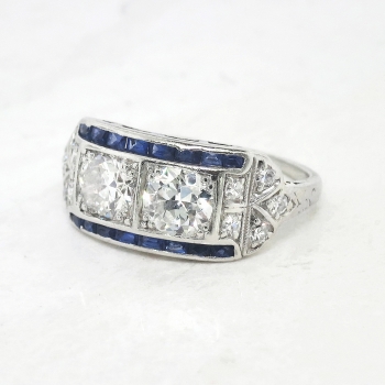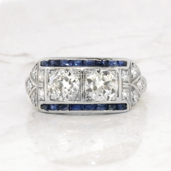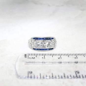 This phenomenal Art Deco ring is unique yet classic! Don't miss out on this stunning double old European cut diamond and calibre' cut lab sapphire ring set in a subtle engraved platinum mounting. This ring features two old European-transitional cut diamonds between two channels of rectangular French cut synthetic sapphires, flanked by a total of ten single cut diamonds, on a foliate-engraved shank which measures from 1.01 to 2.95 mm in width. The central old cut diamonds each weigh approximately .54cts each and have the quality grade of G-H color, VS1 clarity. Those diamonds are adorned by sixteen synthetic sapphires that measure an approximate average of 2.25mm x 1.20mm, and weigh approximately .02cts each. The twinkling single cut diamonds are graded G-H color, VS1-VS2 in clarity, and weigh approximately .02cts. This magnificent irreplaceable ring has a grand total gem and diamond weight of approximately 1.60ct t.w.. This ring measures 9.07mm North to South, 19.75mm East to West, and is raised 3.5mm off the finger. The ring is stamped “IRID PLATINUM” and is made in 10% iridium, 90% platinum (standard Art Deco era platinum mixture). This ring weighs 4.2 grams, is currently a finger size 6.5, and my trusted jeweler can safely re-size this up or down to two sizes free of charge, just ask (additional sizes up will be a flat $75.00 platinum fee, just ask!). I will be more than happy to include a certified retail replacement insurance appraisal upon completion of sale, just ask! and questions are welcomed on Ring-1577.