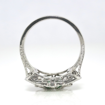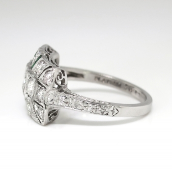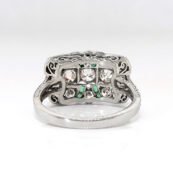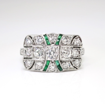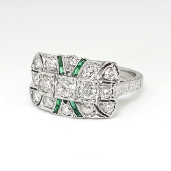 Don't miss out on this rare and beautiful 1930's era cocktail ring or alternate engagement ring! It has crisp hand engraving, emerald hued manmade calibre' cut accent stones, and twinkling old transitional cut round brilliant and old European cut diamonds! It's such a special ring! This ring is bead-set with fifteen round brilliant and Old European cut diamonds within geometric mountings, and channel-set with eight rectangular French cut synthetic emeralds, atop a scrollwork gallery, on a flat, engraved shank which measures from 1.76 to 2.48 mm in width. The diamonds have the quality grade range of G-I color, SI2-I1 clarity, weigh .04cts to .11cts each, and have a grand total carat weight being .81ct t.w.. The synthetic emeralds [visual identification only] are eye clean, color: B2G80, display 80% brilliance, and weigh approximately .02 carats each. The synthetic (era appropriately man-made- it was very popular back then!) emeralds have a grand total carat weight of approximately .97ct t.w.. This ring has a grand total gem and diamond carat weight of approximately 1.78ct t.w. This ring measures 10.55mm North to South, 16.mm East to West, and is raised 3mm off the finger. The ring is stamped “PLATINUM 5% IRID”, weighs 4 grams, and is currently a finger size 5.5. My trusted jeweler can safely re-size this up or down two sizes free of charge, just ask (additional sizes up will be a flat $75.00 platinum fee, just ask!). Layaway and questions are welcomed on Ring-1684.