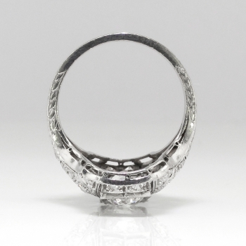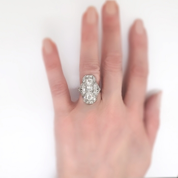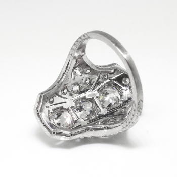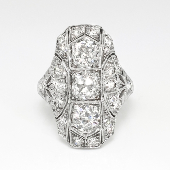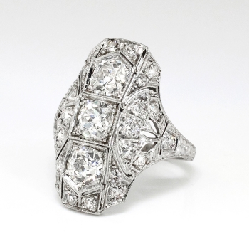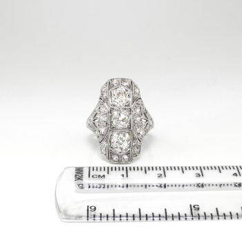 This is one extraordinary Art Deco 1930's diamond ring made in an ornate and glittering platinum filigree and engraving mounting. This ring features 2.07ct t.w. of old European cut and single cut diamonds. All the diamonds have the quality grade range of I color, SI1-I1 clarity. The three central North to South diamonds total approximately 1.57ct t.w. each, and the additional tiny single cut and old European cut diamonds total .50ct t.w., making this a true knockout ring for one lucky lady! This ring weighs 6.6 grams, measures 23.75mm North to South, 19mm East to West, and is raised 4mm off the finger. This ring is currently size 5.5 and my trusted jeweler can safely re-size this up or down two sizes free of charge, just ask (additional sizes up will be a flat $75.00 platinum fee, just ask!). The mounting is tested and guaranteed platinum, has US origin, and can be worn on any finger! Questions are welcomed on Ring-1711.