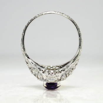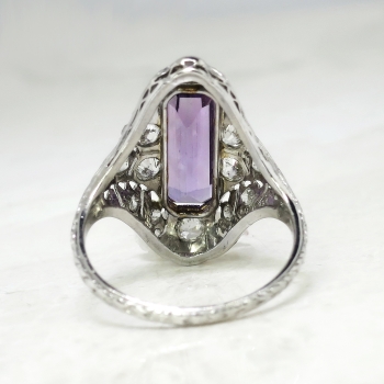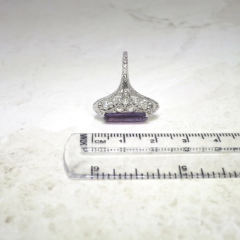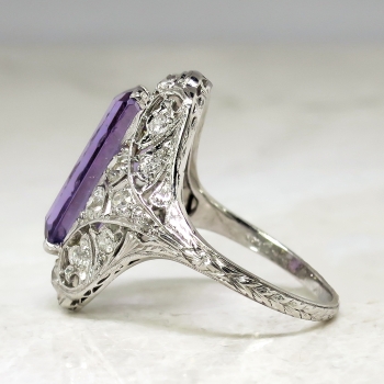 This is one extraordinary Art Deco 1930's amethyst and diamond ring made in an ornate and glittering platinum filigree and engraving mounting. This ring features one central, natural and elongated emerald cut amethyst weighing approximately 2.76cts. That gemstone has medium strong purple hue, a VVS clarity, and a good cut. I love finding rings with such uniquely shaped gemstones! That glorious gemstone is accented by .72ct t.w. of old European cut diamonds. Those diamonds have the quality range of I color, SI1 clarity. This ring weighs 4.9 grams, measures 18mm North to South, 22.50mm East to West (diamond to diamond), and is raised 7mm off the finger. This ring is currently size 6.25 and my trusted jeweler can safely re-size this up to four sizes or down to two sizes free of charge, just ask! The mounting is made in the Art Deco standard of 10% iridium, 90% platinum and has US origin. What a great find that can be worn on any finger! This is my absolute favorite amethyst ring to date! Questions are welcomed on Ring-1553.