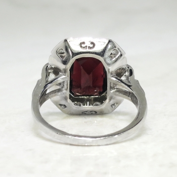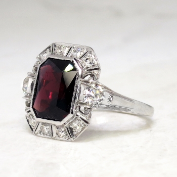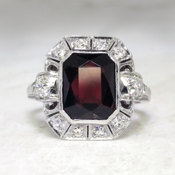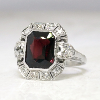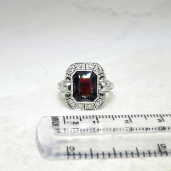 This is one extraordinary ring!!! I have never found an original handmade garnet ring from this era made in platinum; truly magnificent. I want this. But I truly can't keep everything! This ring features a central rich maroon natural almandine garnet weighing approximately 3.76cts (10mm x 8mm) and 10 glittering old European cut diamonds totaling .48ct t.w. (I color, VS1-VS2 clarity) all set in luxurious platinum. This ring has a grand total gem and diamond weight of approximately 4.24ct t.w. and is true show stopper! This ring measures 15.35mm North to South, 15.75mm East to West, and is raised 5mm off the finger. This ring has US origin, weighs 6 grams, is currently a finger size 5.5, and my trusted jeweler can safely re-size this up to four sizes or down to two sizes, just ask! I will be more than happy to type up a retail insurance replacement appraisal upon completion of sale, just ask! Layaway and questions are welcomed on Ring-1554.
