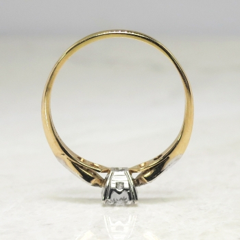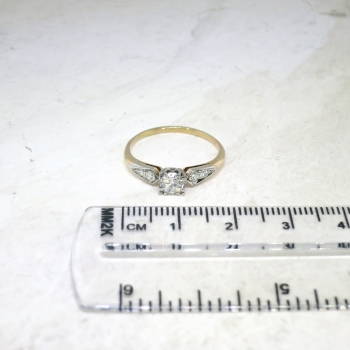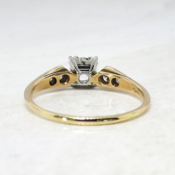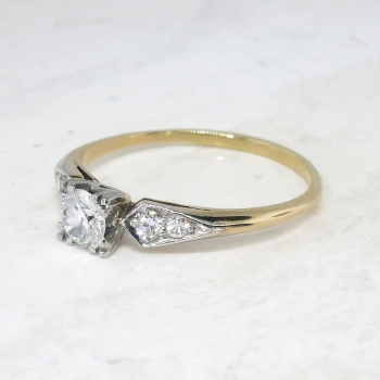 Simply beautiful! An elegant and timeless engagement ring from the 1930's made in a two tone 14k yellow gold and platinum mounting (stamped). The central old European cut diamond weighs approximately .30cts and has the fine quality grade of E color, VS2 clarity. The four additional bead set accent diamonds have an accumulative carat weight of .14cts and are graded G-H color, SI1 clarity. All diamonds are set in platinum with the shank and additional metal being 14k yellow gold. This ring has a grand total carat weight of .44ct t.w.. The ring measures 4.8mm North to South and is raised subtly 4.75mm off the finger. This ring weighs 1.9 grams and is currently a finger size 7. My trusted jeweler can safely re-size this up to four sizes or down to three sizes free of charge, just ask! I will be more than happy to include a retail insurance replacement appraisal upon completion of sale, just ask! Layaway and questions are welcomed on Ring-1551.