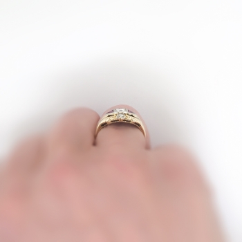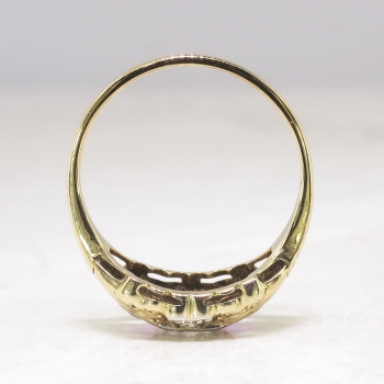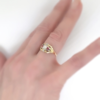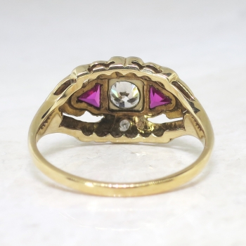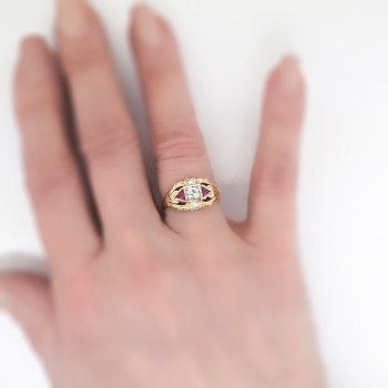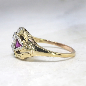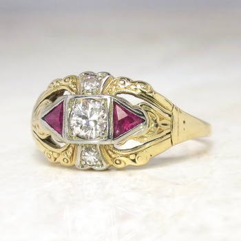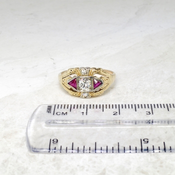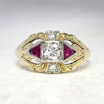 I love the detailing and pop of red in this authentic 1930's ring! It has such romantic and tiny swirling details, fine old cut diamonds and flashes of red gems! This ring is made in 14k yellow gold with platinum accents holding the diamonds. Those diamonds consist of a central .26ct old European cut diamond with the quality grade of I color VS2 clarity, and two North to South old single cut diamond accents each weighing approximately .05cts each with comparable quality. A total diamond carat weight being .35ct t.w.. Those diamonds are accented by bezel set trillion cut .20ct lab created rubies (.40ct t.w. era appropriate man made rubies that look absolutely real!). This ring has a grand total gem and diamond weight of approximately .75ct t.w.. This ring measures 10mm North to South, 18mm East to West, and is raised 4mm off the finger for a low profile and elegant ring. This ring has US origin, is stamped 14k with the platinum top testing as platinum! A subtle, colorful and beautiful ring for one lucky lady! This ring weighs 2.5 grams, is currently a finger size 6.75 and my trusted jeweler can safely re-size this up to four sizes or down to two sizes free of charge, just ask! I can type a retail insurance replacement appraisal upon completion of sale, just ask! Layaway and questions are welcomed on Ring-1562.