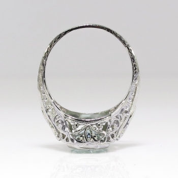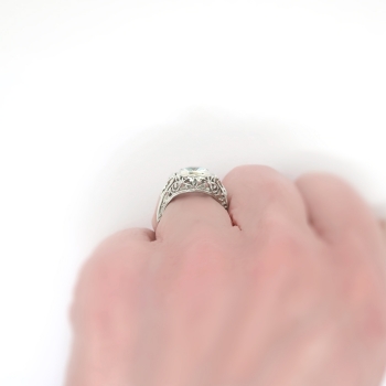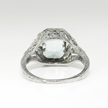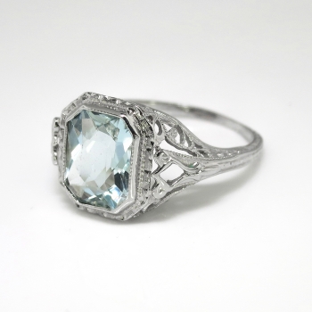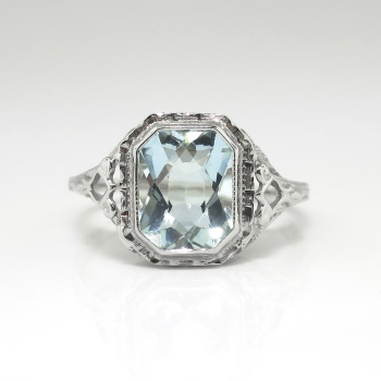 Finding this perfectly executed and pristine Art Deco aquamarine solitaire rings are getting harder and harder to find; get yours here from Jewelry Finds for a wonderful value in immaculate condition. A circa 1930's Art Deco pristine 18k white gold filigree and aquamarine ring perfect as an alternate engagement ring, birthstone ring, or because you love vintage jewelry. The glistening natural fancy rectangular cut aquamarine measures 8.79mm x 7.30mm x 4.23mm and weighs approximately 1.99cts. This ring measures 10.90mm North to South, 17mm East to West, and is raised 5.5mm off the finger. It is stamped 'B 18k' and maker unknown but US origin. The ring weighs 2.5 grams, is a finger size 5.25, and can easily be re-sized by my trusted jeweler up or down two sizes free of charge, just ask (additional sizes up will be a flat $45.00 gold fee, just ask! Beautiful open filigree gallery that is a timeless, classic piece of yesterday. I will be more than happy to email a current retail replacement appraisal upon completion of sale, just ask! Questions are welcomed on Ring-1852.