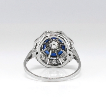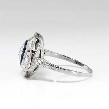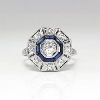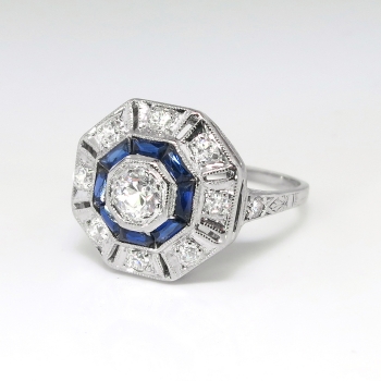 Hello, Gorgeous! This glorious art deco diamond and lab created sapphire double halo engagement ring will impress the pickiest of jewelry admirers! The central sparkling old European cut diamond weighs an approximate .26cts and has the quality grade of I color, SI1 clarity. The ring has a hexagon shape with sparkle, a bit of blue beauty, and an era appropriate hand engraved delicate shank. Around that diamond are eight synthetic lab created (era appropriate) blue french cut sapphires weighing an accumulative .25ctw. In addition to the central diamond are 10 .02ct early transitional round brilliant cut round brilliant diamonds accenting the ring with a total accent gem and diamond carat weight of approximately .20ctw. These diamonds are I color, SI1 clarity. This ring has an approximate grand total gemstone and diamond weight being .71ct t.w.. This ring is made entirely in platinum (stamped 10%IRID.PL), measures 13.8mm in diameter, is raised 5.75mm off the finger and is currently a finger size 6.75. My trusted jeweler can easily re-size this ring up or down two sizes free of charge and will take an additional 1-5 business days, just ask (additional sizes up will be a flat $75.00 platinum fee, just ask). I will be more than happy to email a current retail replacement appraisal upon completion of sale, please ask. The ring weighs 3.7 grams and is in pristine vintage condition! Questions are welcomed on Ring-1878.