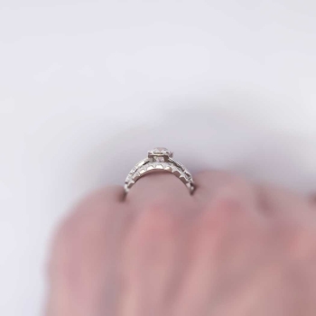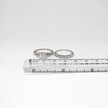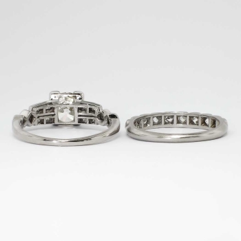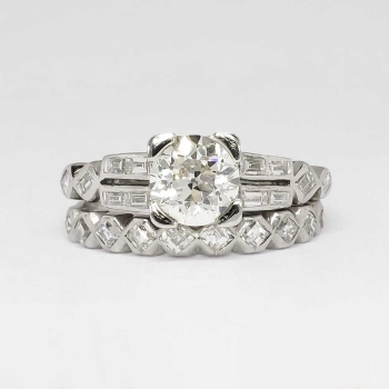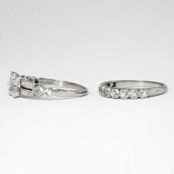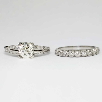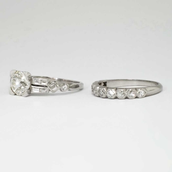 An eye catching tailored yet unusually detailed Art Deco engagement ring set with a twinkling old diamond and beautiful accent baguette and French cut diamonds all made in platinum! So gorgeous! The perfect combination of geometrical diamond and French cut angeled set accents and a clean presentation! With a matching band! What a find!!! The engagement ring features a central old European cut diamond that weighs 1.16cts and has the quality range of J color, SI2 clarity. It is set in a lovely platinum mounting accented with 12 straight baguette cut diamonds with an accumulative weight of .40ctw. They have the quality range of G-H in color, VS2-SI1 in clarity. This ring measures 11.84mm North to South, is raised 8mm off the finger approximately, and the shank tapers from 3mm to 1.5mm. The platinum and nine diamond wedding band matches perfectly, having angeled set French cut diamonds safely bezel set with comparable quality and a grand total carat weight of .45ct t.w.. The wedding band measures 2.92mm wide and is a rare find! This set has a total diamond carat weight of approximately 2.01ct t.w.! These rings are currently a finger size 6.75 and 6 for the band, and can be easily resized by my trusted jeweler, just ask! This set weighs grams. 3.7 grams for the engagement ring and 2.7 grams for the wedding band. A retail replacement appraisal from Jewelry Finds LLC will be emailed upon completion of sale, just ask! Questions are welcomed on this beautiful wedding set, Ring-Set-1398.