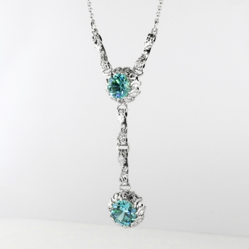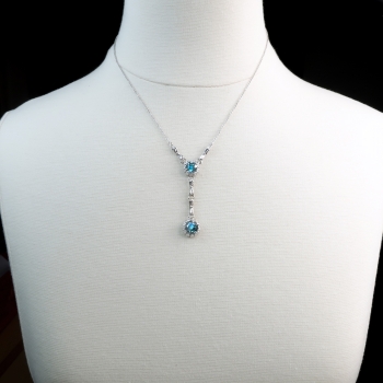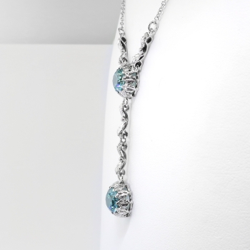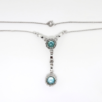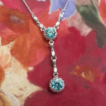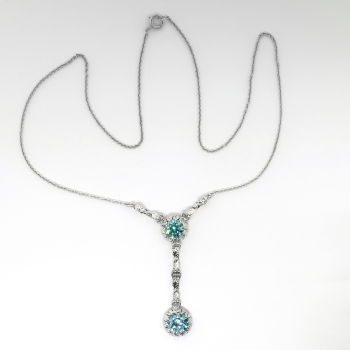 This rare and pristine white gold necklace hails from the swinging 30's and has recently been rhodiumed (dipped in white gold) to look even whiter to enhance the ENORMOUS turquoise hued beaming NATURAL zircons! This necklace doesn't even need diamonds!!! The necklace measures 17 ½” long (the pendant measures 2.5" inches in length) and comprises a 10k white gold, round, leaf-motif mounting set with one round mixed cut zircon, from which is suspended a second round, leaf-motif mounting set with one round mixed cut zircon, fixed at the center of two lengths of 14k white gold, 1.00 mm wide cable chain, terminating in a spring ring clasp. The larger natural zircon measures approximately 8.26 x 8.26 x 5.13 mm, and weighs approximately 3.29cts. The smaller one measures approximately 7.40 x 7.40 x 4.91 mm, and weighs approximately 2.53cts. This elaborate yet simple necklace has a grand total zircon weight of approximately 5.82ct t.w.! The clasp is stamped “14K” and this necklace as a whole weighs 6.5 grams. Jewelry Finds® offers complimentary shortening of chains. The cost of lengthening a chain will be determined on a case by case basis so please inquire :). I will be more than happy to email this piece's current certified and guaranteed retail replacement appraisal upon completion of sale, just ask! Questions are welcomed on Necklace-1950.