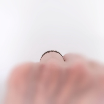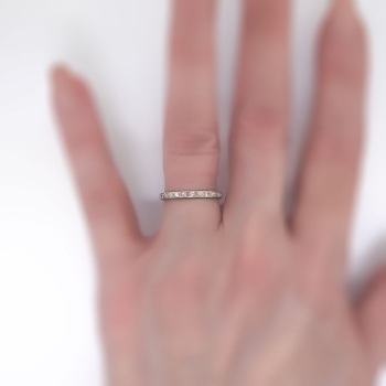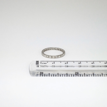 A gorgeous 1930's platinum and bead set filigree diamond eternity band to wear with that vintage or antique engagement ring, or to stack with other rings! It lays perfectly flat and is comfortable as can be! A delicate 2mm wide platinum wedding band, size 5.5, with approximately .50ct t.w. of G-I color, SI1-SI2 clarity old European cut and single cut diamonds. It is in beautiful nearly antique condition (80+ years old!) and has a ton of detail work up close to keep you busy at work :). Questions are welcomed on Ring-1418.