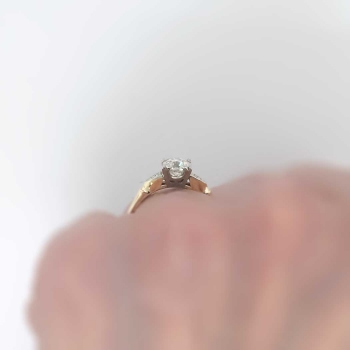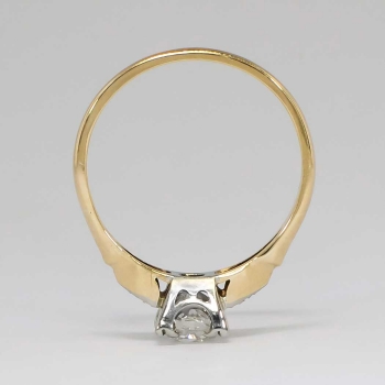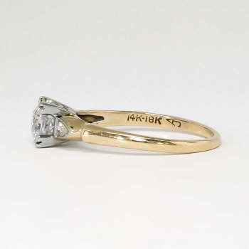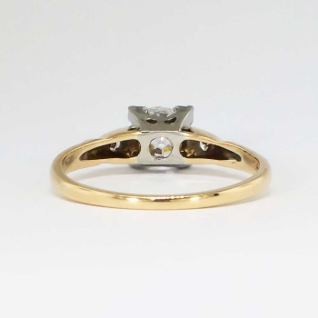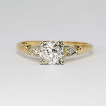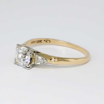 This timeless find hails from the swinging 30's and has every element we all love about vintage rings! It has a versatile two tone design, great sparkling old cut diamonds, and a clean and classic look. This ring features a central old European cut diamond weighing approximately .83cts with the quality grade of J color, SI1 clarity. That diamond is adorned by two .01ct single cut diamonds with comparable quality in a two tone 14k /18k mounting (top white gold is 18k, bottom yellow gold is 14k). This ring has a grand total diamond weight of .85ct t.w.. The head of this ring measures 4.7mm North to South, 5.9mm East to West, and is raised 5.5mm off the finger. This ring weighs 2 grams, is a finger size 7.5, and my trusted jeweler can safely re-size this up or down four sizes, just ask! Questions are welcomed on Ring-1384.