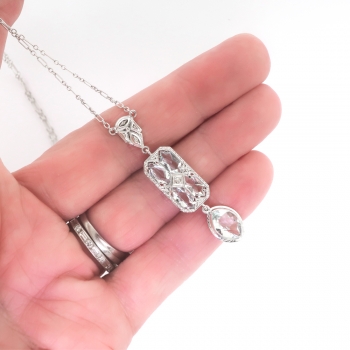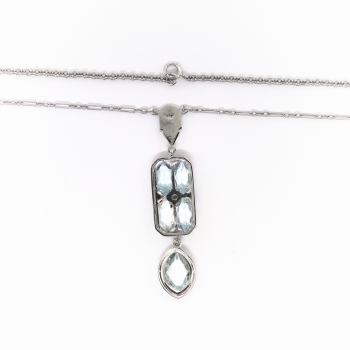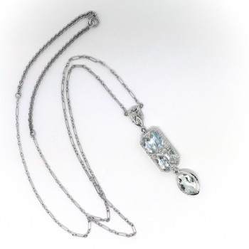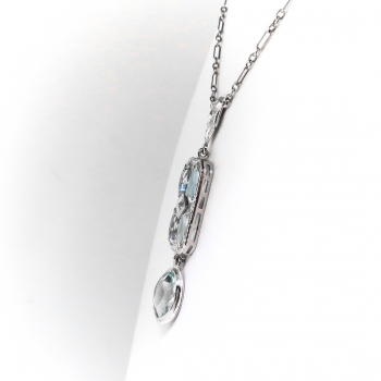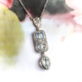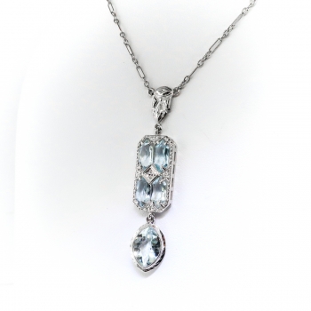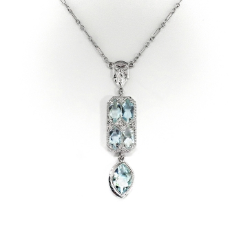 This necklace is absolutely breathtaking and will look amazing with any of your Art Deco jewelry! Especially that aquamarine ring that needs a new friend. This is a lovely and versatile vintage necklace that can be worn day to night! Or even better, it's 'Something Old, Something New, Something Blue' for your wedding! I almost want to keep this one! But it will be someone's perfect wedding pendant or graduation gift! I can't keep everything- and look at that chain! This is a circa 1930's pristine 14k white gold, natural aquamarine, and diamond necklace, of cast and assembled construction. The necklace measures 19 ½” long and comprises a 1 7/8” long pendant drop fixed between two lengths of mixed cable chain and round cable chain, terminating in a spring ring clasp. The pendant drop comprises a bezel-set, marquise mixed cut aquamarine suspended from a rectangular mounting bead-set with four double bullet cut aquamarines. The aquamarines are the perfect ice blue hue and the filigree and tiny accent diamonds really set it off! One measures approximately 9.98 x 7.23 x 3.84 mm, and weighs approximately 1.43 carats. Four measure approximately 8.05 x 4.22 x 2.72 mm, and weigh approximately 0.48 carats each. Approximate total gem weight: 3.35 carats. One tiny single cut diamond in the center is hidden in between glorious blue gems! The diamond weighs approximately .03cts and has the quality grade of H-I color, SI clarity. This necklace has an approximate grand total gem weight being 3.38ct t.w.. The necklace is stamped “14K.” has been entirely tested and guaranteed to be 14k white gold and weighs 4.2 grams. The chain measures 18" inches. It will truly make a statement! I will be more than happy to email you a current retail replacement appraisal upon completion of sale, just ask! Questions are welcomed on Necklace-2535.