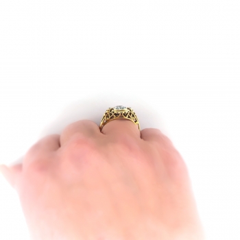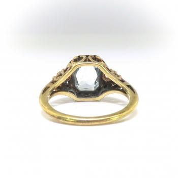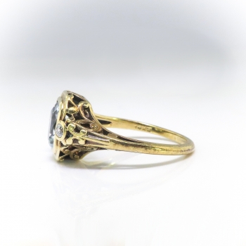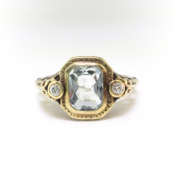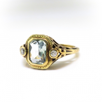 This is one of my favorite aquamarine finds to date! It screams Art Deco elegance, and I must admit, I almost kept it. It has every element you would want from a vintage ring; an unusual antique cut ocean blue aquamarine, twinkling antique cut diamonds, and pristine open filigree work in solid yellow gold. This is a beautiful 14k yellow gold, natural aquamarine beryl, and old European cut diamond ring, of cast and assembled construction, circa 1930's. The ring comprises a bezel-set cut corner rectangular mixed cut aquamarine, flanked by two bezel-set old European cut diamonds, on a half-round yellow gold shank atop a scrollwork gallery. The center mounting measures approximately 11.07mm x 9.53mm and has clean Deco lines with scrolly delicious filigree. The aquamarine is safely bezel set, is in excellent condition (80+ years old!) measures approximately 7.86mm x 6.05mm x 3.53mm, and weighs approximately 1.23 carats. The two bezel set old European cut diamonds are SI1-SI2 in clarity, G-H in color, cut grade: good, measure approximately 2.40mm in diameter, and weigh approximately 0.05 carats each (.10ct t.w.). Approximate total gem weight: 1.33 carats. The ring is stamped “14K” has been entirely tested and guaranteed to be solid 14k yellow gold, weighs 3.8 grams, and is currently a finger size 7. Ring sizing is a $45 gold sizing fee (over 3 sizes is a flat $75 gold fee) and takes an additional 3-7 business days, just message me prior to checking out and I will set that up promptly. I will be more than happy to email you a certified current retail replacement appraisal upon completion of sale, just shoot me a message after receiving your piece and I will send it right over! Questions are welcomed on Ring-2520.