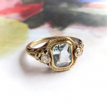 Jewelry FindsArchiveArt Deco Aquamarine Diamond Ring Vintage Circa 1930's 1.33ct t.w. Filigree Old European Cut Birthstone Engagement Ring 14k Yellow Gold