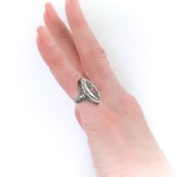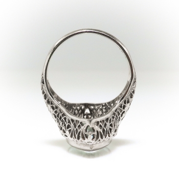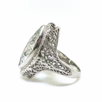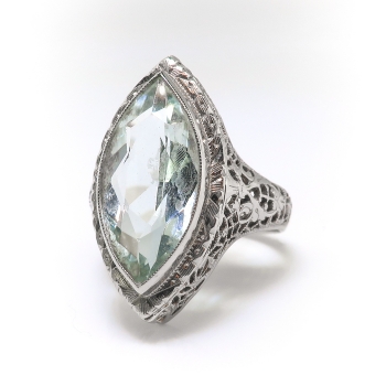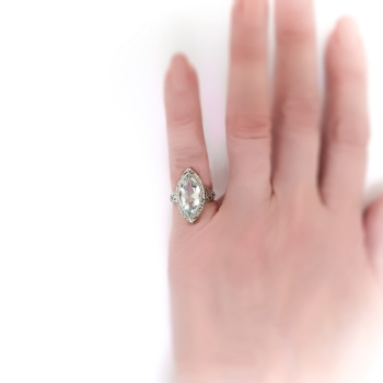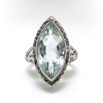This true Art Deco staple piece- a filigree adorned simple aquamarine in white gold- will be the perfect addition to your vintage jewelry collection! This ring is so special and unusual with it's fancy antique cut ice blue aquamarine and elaborate hand chase work and filigree! The exquisite & large antique marquise cut aquamarine is the ideal puffy marquise shape and is subtle enough to wear everyday, but elaborate to wear for fancy occasions! The ring comprises a marquise cut aquamarine bezel-set at the center of a marquise-shaped filigree mounting measuring 20.95 x 11.40 x 8.00 mm, on a half-round shank with filigree shoulders, which measures 1.85 mm in width at the back. The natural aquamarine measures approximately 15.95 x 8.06 x 4.97 mm, and weighs approximately 3.30 carats. The ring is stamped with a maker’s mark “18” meaning 18k white gold, is flanked by reflected letters “L”, weighs 3.6 grams, and is currently a finger size 3.25. I can have my trusted jeweler re-size this for you at no additional charge, just ask (sale rings flat $45.00 sizing fee, please inquire). I can also email this piece's current retail replacement appraisal upon completion of sale, please inquire. I can re-tip the prongs for you at no charge, just ask. I will be more than happy to email this piece's current certified and guaranteed retail replacement appraisal upon completion of sale, just ask! Questions are welcomed on Ring-2291.